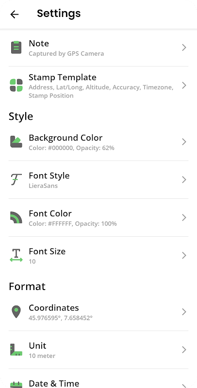 जीपीएस कैमरा स्टैम्प के साथ, आप अपने फोटो और वीडियो पर जीपीएस स्टैम्प, पूरा पता, अक्षांश, देशांतर, ऊंचाई, स्थान सटीकता, चुंबकीय सेंसर, कंपास हेडिंग और कस्टम नोट्स ओवरले कर सकते हैं। UTM या MGRS निर्देशांक, अनुकूलन योग्य फोंट और फ़ॉन्ट आकार के साथ अपनी प्रदर्शन प्राथमिकताओं को अनुकूलित करें। कस्टम टाइमज़ोन, फ़ाइल नामकरण और फ़ोल्डर विकल्पों के साथ अपनी फ़ाइलें व्यवस्थित करें।