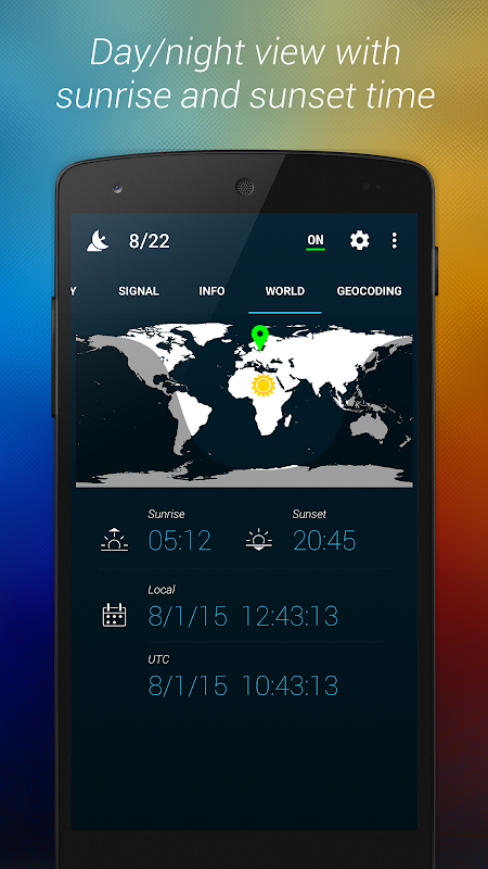 4) विश्व टैब - विश्व मानचित्र दृश्य डिवाइस की स्थिति प्रस्तुत करता है, यह वैश्विक सूरज की स्थिति और दिन-प्रकाश / रात-अंधेरे क्षेत्र को भी दर्शाता है। जीपीएस से स्थानीय और यूटीसी तिथि समय है, सूर्योदय और सूर्यास्त का भी समय उपलब्ध है।