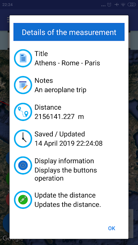 1. मानचित्र पर क्लिक करके दो या दो से अधिक बिंदुओं के बीच की दूरी की गणना करें। हर बार एप्लिकेशन दूरी प्रदर्शित करेगा। हर बार जब आप डिलीट बटन दबाते हैं तो आप अंतिम बिंदु को हटा सकते हैं। माप को बचाने के लिए आपको कम से कम दो बिंदु चाहिए। इसके अलावा, आपके पास नेटवर्क या जीपीएस प्रदाता का उपयोग करके मानचित्र पर वर्तमान स्थान प्रदर्शित करने का विकल्प है।