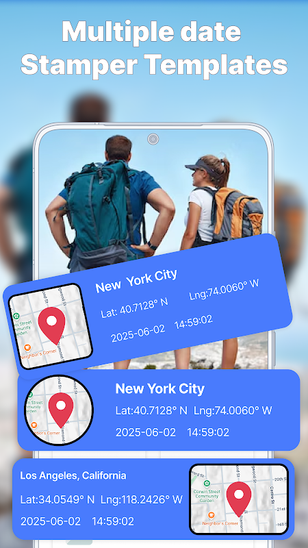 10 से ज़्यादा तैयार टेम्प्लेट में से चुनें और उन्हें अपनी शैली के अनुसार कस्टमाइज़ करें। आप टेक्स्ट का रंग, आकार, फ़ॉन्ट और बैकग्राउंड का रंग एडजस्ट कर सकते हैं, साथ ही वॉटरमार्क में लोकेशन और तारीख वाले सेक्शन को छिपा या दिखा सकते हैं। ऐप आपको GPS का इस्तेमाल करके अपनी लोकेशन अपने आप जोड़ने या पूरे नियंत्रण के लिए उसे मैन्युअल रूप से दर्ज करने की सुविधा भी देता है।