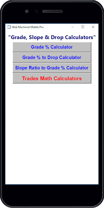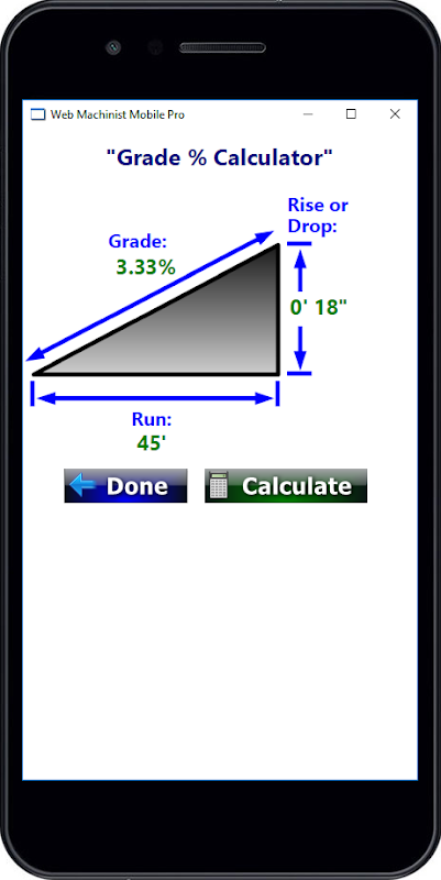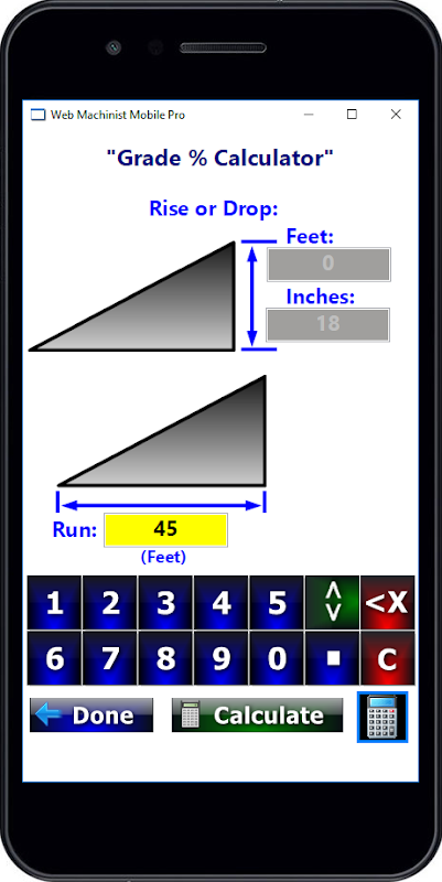 Calculate Grade Slope Drop Percentage for Excavation jobs quickly and easily. This is a great APP for landscapers and landscaping contractors! Trades Math Calculators is an excellent APP that can Quickly and easily make calculations for Concrete / Cement Estimating, Board Feet Estimating, Bricks Estimating, Grade, Slope and Drop Calculators, Landscape excavation Calculators,Stairway and Staircase building calculator, Grading Slopes, Grade Rise calculators, Grade percent calculator, wall studs estimating calculator, tooling calculators, angle calculators, quantity of Wall Studs Needed Estimating, Rebar Weight Estimating, Stairway Estimating, Ohm's Law Calculators including: Appliance Calculator, Amps, Watts, Volts & Ohmns, Direct Current Calculators. Conversions Calculators including: Angular Conversions, Area Conversions, Energy Conversions, Length Conversions, Power Conversions, Torque Conversions, Velocity Conversions, Volume Conversions and Weight Conversions. Trigonometry and Geometry Calculators and Shop Math Calculators. Tapping Calculators including: Tap Drill Sizes, Tapping Speeds. Tooling Calculators including: Countersink Calculators, Center Drill Calculators, Drill Bit Sizes, Drilling Speeds. This is a must have APP for Carpenters, Construction Pros, Electricians, Landscapers, Handyman and Do it Your Selfers!