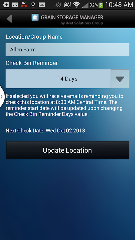 The Grain Storage Manager App (GSM) is a free tool developed for grain farmers that allows them to manage the storage of their crops from the field to the bin and then to delivery or sale. The GSM App lets the user easily create virtual bins, set their capacity, location and crop and then track the crop loaded in or loaded out of that bin throughout the year. The graphical interface shows the current usage (percentage of capacity), total bushels housed and each transaction recorded for loads in and out of the bin.