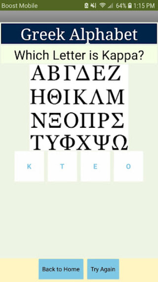 यह ऐप बच्चों को ग्रीक वर्णमाला समझने में मदद करने के बारे में है। इसलिए जब आपको पॉप क्विज़ या यूनिट टेस्ट के लिए ग्रीक वर्णमाला सीखनी होती है, तो यह ऐप उन उद्देश्यों के लिए बिल्कुल फिट बैठता है। न केवल परीक्षण के लिए ग्रीक वर्णमाला सीखना, बल्कि आप इसे अपने लिए भी सीख सकते हैं। बच्चों को बेहतर ढंग से समझने में मदद करने के लिए यह ऐप परीक्षण जैसे प्रारूप में तैयार किया गया है। इसके अलावा आपको बस आरंभ पर क्लिक करना है, और वहां से आप प्रत्येक प्रश्न के लिए चार अलग-अलग उत्तर विकल्पों में से चुन सकते हैं।