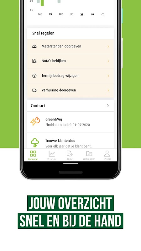 फ्री ग्रीनचॉइस ऐप से आप खुद कई ऊर्जा मामलों की व्यवस्था कर सकते हैं। सरल, कभी भी, कहीं भी। इस तरह आपको अपने ऊर्जा बिल पर एक पकड़ मिलती है।