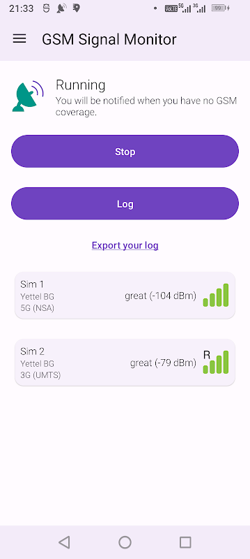 'जीएसएम सिग्नल मॉनिटर' सिग्नल से संबंधित हर घटना को अपने नोटिफिकेशन लॉग में लॉग करता है। अधिसूचना लॉग जीएसएम सिग्नल खो जाने, बहाल होने या कम होने पर जानकारी रखता है। यह मोबाइल डेटा खो जाने या रोमिंग सक्रिय होने पर भी जानकारी लॉग करता है। आप लॉग इन की गई सेटिंग्स को कॉन्फ़िगर कर सकते हैं। लॉग को सीएसवी, पीडीएफ और एचटीएमएल प्रारूपों में निर्यात किया जा सकता है।