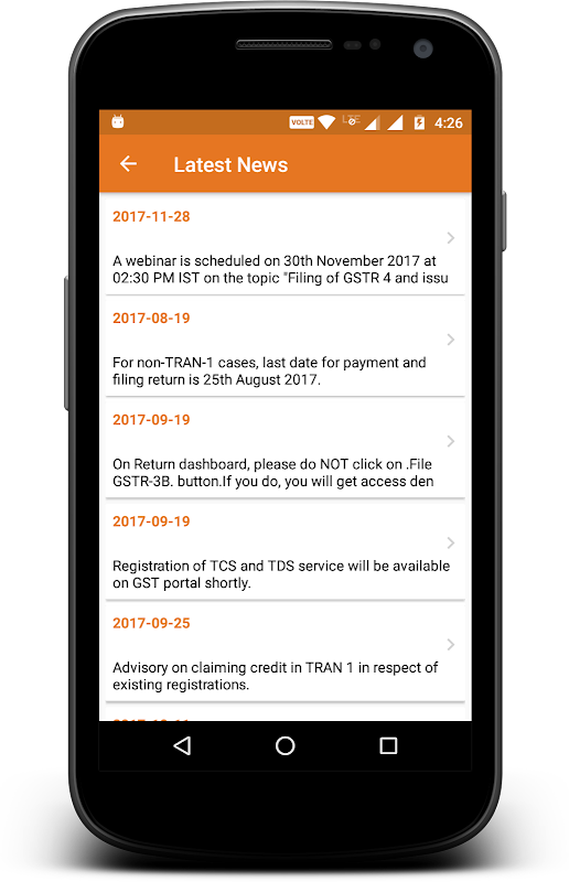 - एचएसएन सूची - एचएसएन (नामकरण प्रणाली का हार्मोनिज्ड सिस्टम) सीजीएसटी नियमों के अनुसार विभिन्न उत्पादों पर जीएसटी की लागू दर की पहचान के लिए 6 अंकों का कोड है। यहां ऐप एचएसएन कोडों की एक सूची प्रदान करता है, जिसमें सीजीएसटी (सेंट्रल जीएसटी), एसजीएसटी (राज्य जीएसटी), आईजीएसटी (एकीकृत जीएसटी) दरों सहित लागू है।