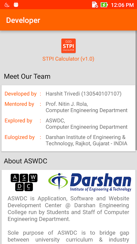 यह ऐप ASWDC में हर्षित त्रिवेदी (१३०५४०१०७१०७) द्वारा विकसित किया गया है, जो एक ७वें सेम सीई छात्र है। ASWDC कंप्यूटर विज्ञान और इंजीनियरिंग विभाग के छात्रों और कर्मचारियों द्वारा संचालित दर्शन विश्वविद्यालय, राजकोट में एप्स, सॉफ्टवेयर और वेबसाइट डेवलपमेंट सेंटर है।