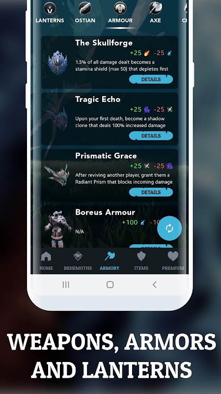 Helper and ally app for Dauntless: Know all the weakness, strengths and drops from each Behemoth, Check out all the recipes to create any weapon or armor in the game, Review the best Perks and Cells, Receive new items and in-game notifications; Consult all the different items in the game like Skins, Lanterns, Emotes, Etc., Check out all the new weapons, and much more.