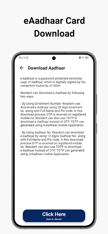 - आधार कार्ड ऑनलाइन डाउनलोड करें (मोबाइल पर आधार कार्ड पीडीएफ में डाउनलोड करें) - यह फ़ंक्शन Google Chrome ऐप में खुलता है।