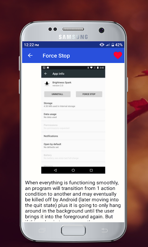 This app guide you how to force stop automatically you phone.Sometimes we don't need them running because we hate those annoying notifications. Not only will this APP help you and some tricks get stop them and make your phone faster and more power-efficient!