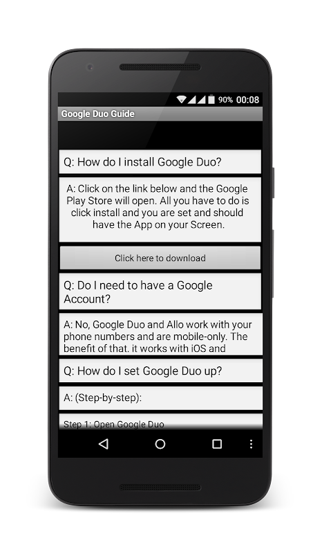 This free Application gives you the possibility to know everything about Google Duo. This is a must have for every Newbie in the Google Duo community. It's not easy to know everything at first, but this App is going to help you out and give you extraordinary tips! It is a guide not the actual app. We have provided links for you to directly download Google Duo from our App!