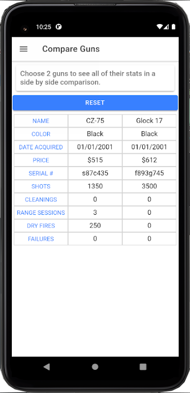 गन ट्रैकर आपको अपनी बंदूकों के लिए विस्तृत रिकॉर्ड रखने की क्षमता देता है। आप राउंड फायर की संख्या, सफाई आदि जैसी चीजों को ट्रैक कर सकते हैं और साथ ही अलग-अलग रेंज सत्रों पर नोट्स भी रख सकते हैं। रेंज और सफाई सत्र स्वचालित रूप से उनके द्वारा दर्ज की गई तिथि के अनुसार व्यवस्थित होते हैं लेकिन बाद में मैन्युअल रूप से संपादित किए जा सकते हैं।
