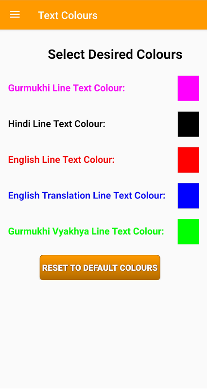 5) ऐप के भीतर गुरबानी लाइनों के टेक्स्ट रंग बदलने का विकल्प। बाएं मेनू से "टेक्स्ट रंग बदलें" का प्रयोग करें।