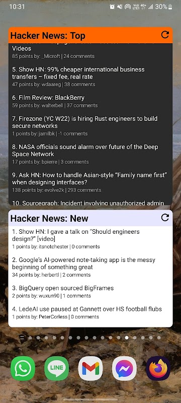 हैकर समाचार के सभी भागों के लिए पूर्ण विजेट ताकि आप अपने होम स्क्रीन पर समाचार देख सकें। ऐप में कई रंग थीम हैं जो विजेट्स में भी समर्थित हैं।