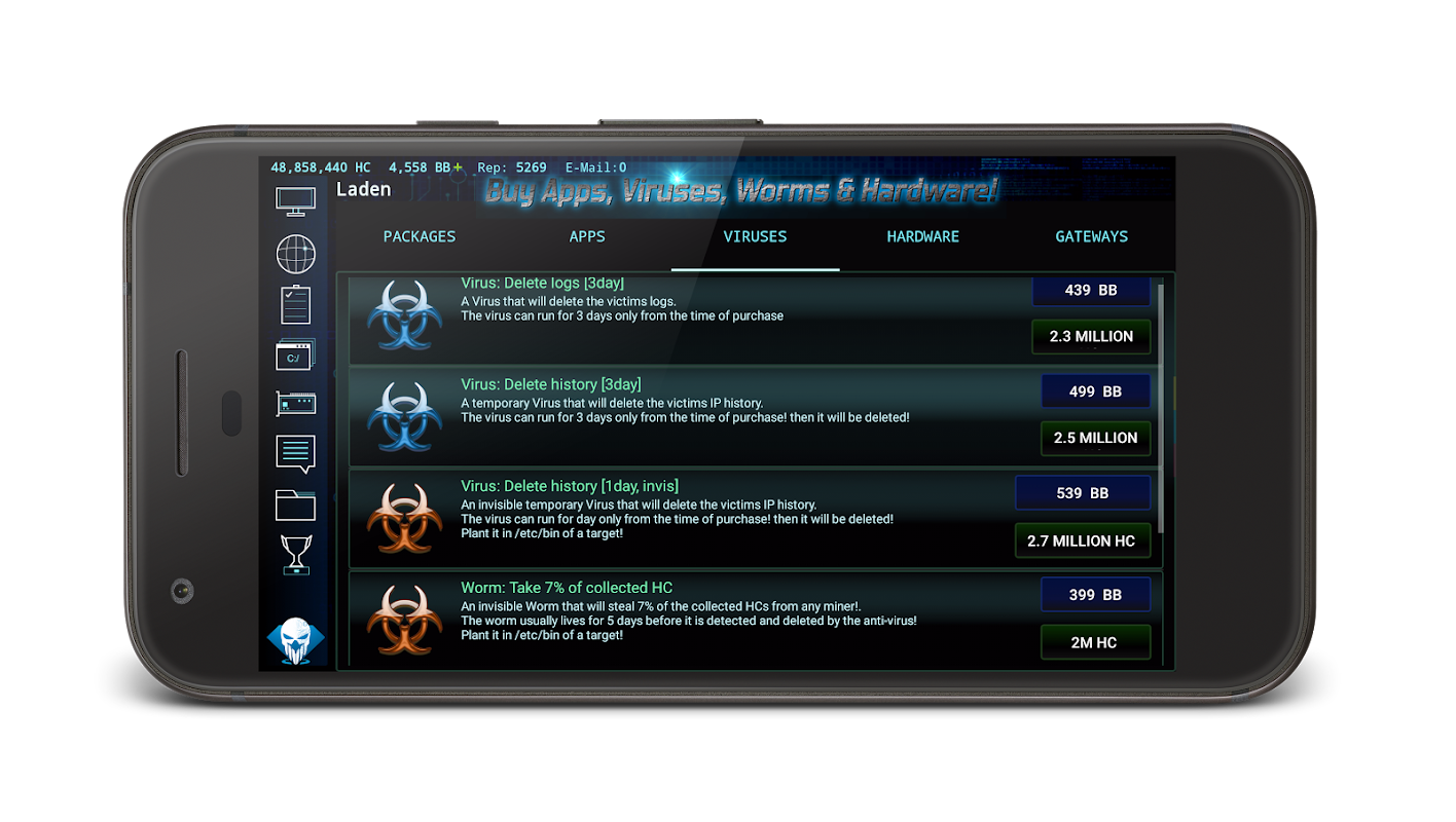 Upgrade your hardware and software, use your A.I and tools to hack into other players and corporations to steal and decrypt secret files, or join a guild and conspire to gain access to another guilds data-centers' main server and destroy it by planting dDoS bots into other players! Meet new friends and plant virtual-viruses in your enemies gateways!