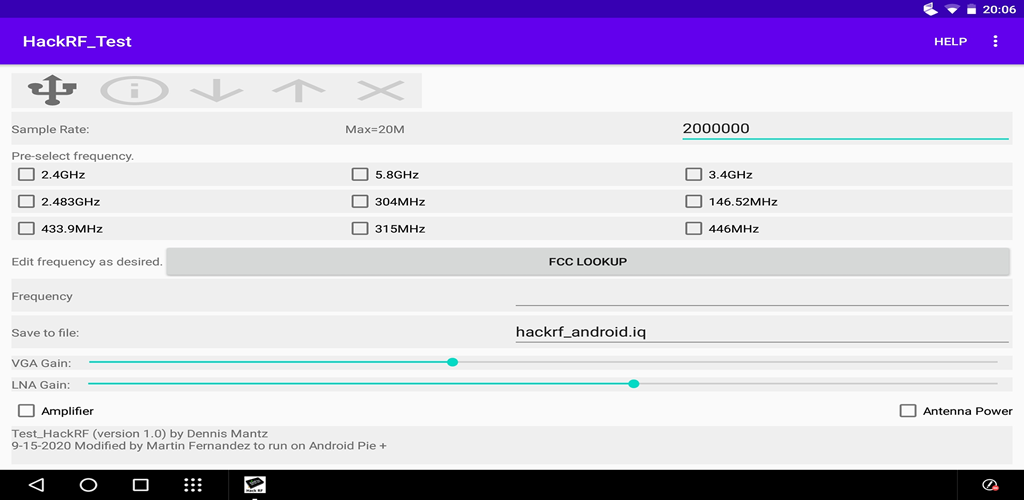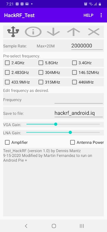 HackRF को USB पोर्ट में प्लग करें और 1 Mhz से 6 Ghz की सीमा के भीतर आवृत्तियों से संकेतों को कैप्चर और रीप्ले करने के लिए इस ऐप का उपयोग करें। मूल स्रोत कोड डेनिस मांट्ज़ से https://github.com/demantz/hackrf_android पर आया था। इस संस्करण में GUI बटन और preselected आवृत्ति विकल्प शामिल हैं, साथ ही, एंड्रॉइड एसडीके 25 और अधिक से अधिक लक्ष्य हैं। संचारित करने के लिए, एम्पलीफायर को अनचेक करने के लिए, एंटीना पावर की जांच करें, LNA स्लाइडर को सभी तरह से मोड़ें और VGA को सभी तरह से मोड़ दें।