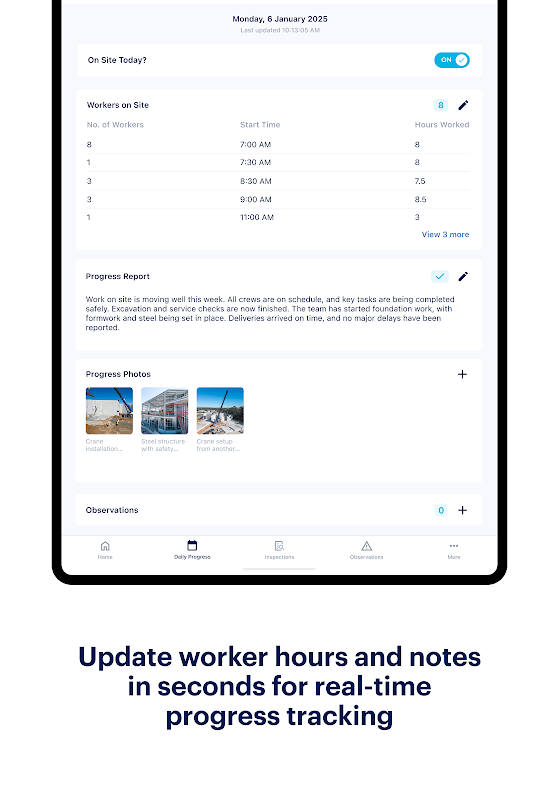 दैनिक प्रगति - वास्तविक समय में प्रगति अपडेट के साथ परियोजनाओं को ट्रैक पर रखें। गतिविधियों को लॉग करें, उत्पादकता को ट्रैक करें और हर दिन कार्यस्थल पर क्या हो रहा है, इसकी जानकारी प्राप्त करें।