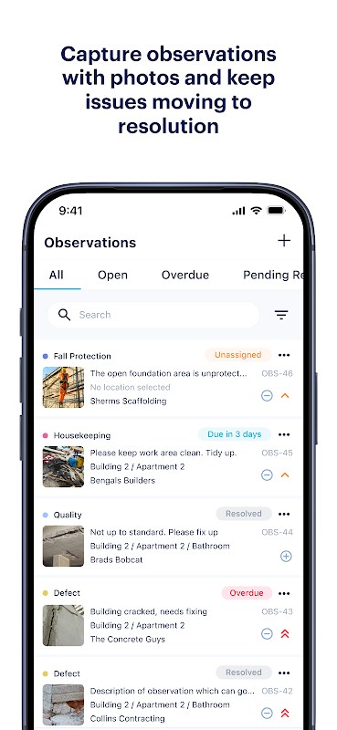 अवलोकन - खतरों, दुर्घटनाओं से बाल-बाल बचने और सुरक्षा संबंधी सकारात्मक अवलोकनों को मौके पर ही दर्ज करें। फ़ोटो जोड़ें, कार्रवाई निर्धारित करें और यह सुनिश्चित करें कि समस्याओं का तुरंत समाधान हो ताकि आपका कार्यस्थल सुरक्षित और अनुपालनपूर्ण बना रहे।