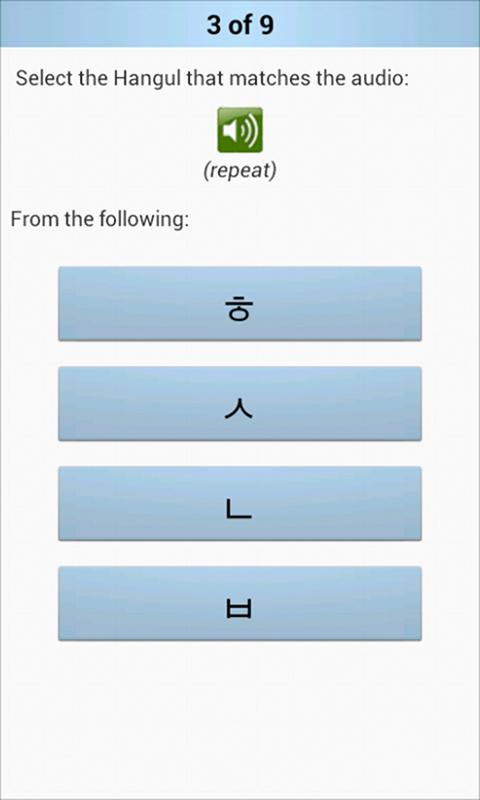 Hangul teaches you the history and structure of the Hangul, then lets you learn the Hangul at your own pace using easy-to-navigate lessons, quizzes, and flashcards.