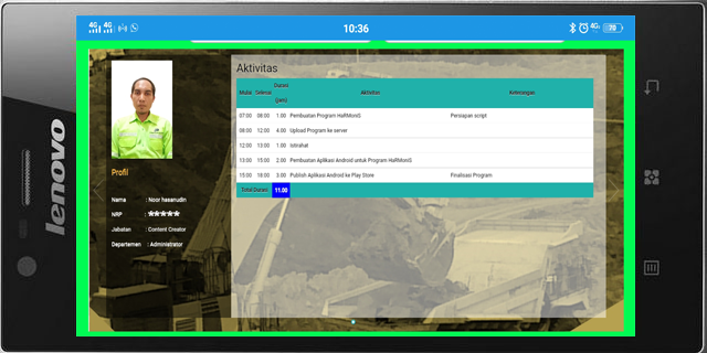 9. Klik "Menu" > "Slide Aktivitas" untuk menampilkan Slide Aktivitas (seluruh karyawan/ per Departemen/ Pilih Karyawan) yang terus bergerak secara bergantian per karyawan. Tahan layar atau arahkan mouse ke posisi slide untuk menghentikan pergerakan slide (Akses terbatas).