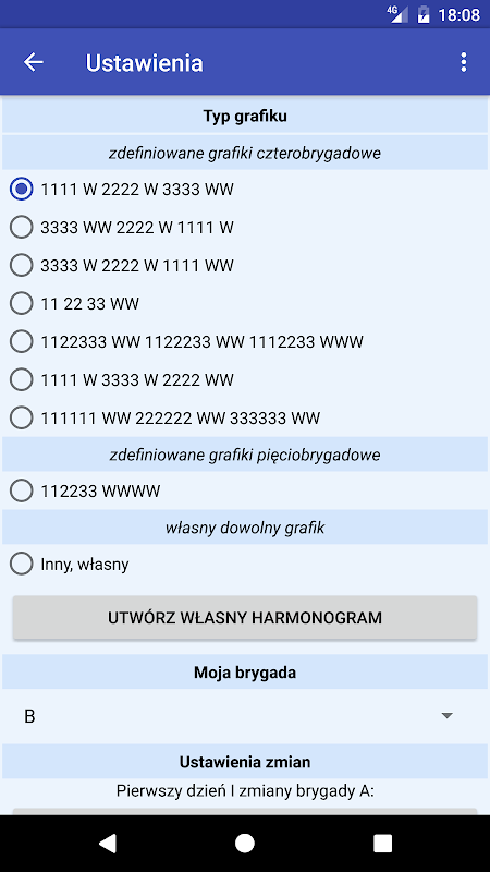कार्यक्रम सेटिंग्स में, व्यक्तिगत ब्रिगेड के लिए कार्य प्रणाली के प्रकार और चक्र के शुरुआती दिनों को परिभाषित करें (ए, बी, सी, डी और ई ब्रिगेड के लिए पहली पाली का पहला दिन (पांच-ब्रिगेड के लिए))। इन आंकड़ों के आधार पर, कार्यक्रम कार्य अनुसूची की गणना करता है।