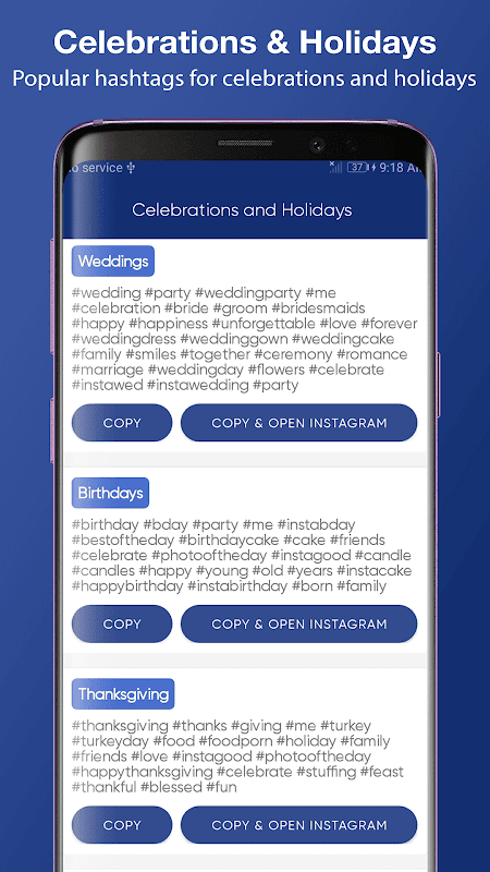 हैशटैग ऐप में सबसे लोकप्रिय और ट्रेंडिंग हैशटैग हैं जो आपके पोस्ट और छवियों पर वास्तविक अनुयायियों और पसंदों को बढ़ाएंगे। इंस्टा के हैशटैग में प्रत्येक श्रेणी में सभी लोकप्रिय हैशटैग होते हैं और आपको बस हैशटैग को कॉपी करना होता है और इसे अपने पोस्ट, इमेज और कैप्शन आदि पर पेस्ट करना होता है। पसंद और वास्तविक अनुयायियों के लिए हैशटैग विशेषज्ञ को कॉपी करें ताकि आपके कैप्शन को कई लोग देख सकें।