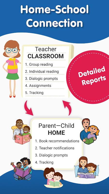हमारा मंच शिक्षकों और अभिभावकों को ज़ोर से पढ़ी जाने वाली कहानियों की एक विशाल श्रृंखला से जोड़ता है। शिक्षक पाठ योजनाओं तक पहुंच सकते हैं, घर पर पाठ्य सामग्री निर्धारित कर सकते हैं और प्रगति की निगरानी सहजता से कर सकते हैं, जबकि बच्चे अपनी पाठ्य सामग्री चुनने की स्वतंत्रता का आनंद लेते हैं। ऐप एक-क्लिक 'असाइन/सुझाव' सुविधा के साथ घर-आधारित पढ़ने को सरल बनाता है, जिससे शिक्षकों को माता-पिता और बच्चों को निर्बाध रूप से मार्गदर्शन करने का अधिकार मिलता है।