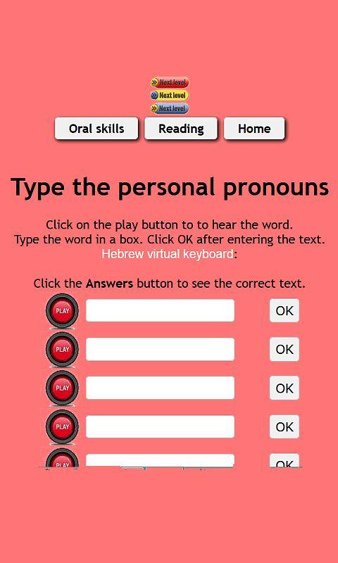 Proceed to read vocalized text with the same professions. Learn to read and spell the different professions. Test yourself. Proceed to learn personal pronouns the same way. Proceed to simple nominal phrase with professions, learn the word order in nominal sentence, how to use a short phrase with personal pronouns, learn how the pronouns are spelled, pronounced and used.