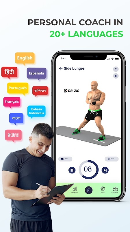 फिटनेस कोच आपको निर्देशित करने के लिए पास के वॉयस ओवर के साथ शानदार वीडियो और 3डी जीवंतता का उपयोग करता है