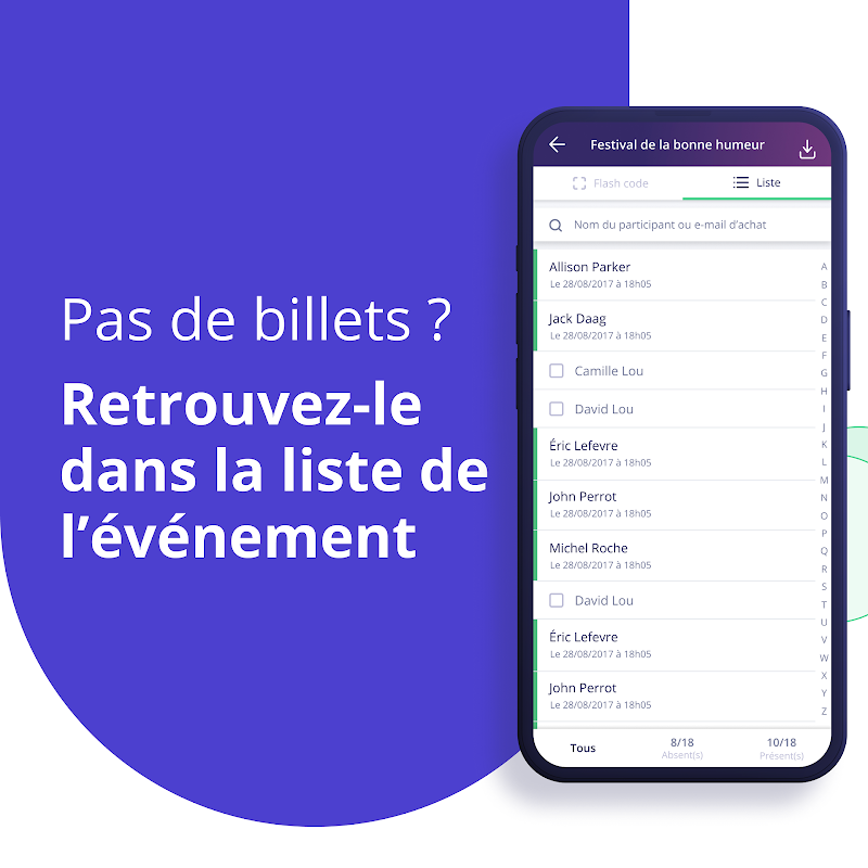 प्रतिभागियों की मुद्रित सूचियों और अपने फ्लोरोसेंट हाइलाइटर्स को भूल जाइए, HelloAsso स्कैन एप्लिकेशन के साथ आप अपने ईवेंट का प्रबंधन करते हैं, चाहे प्रतिभागियों की संख्या कुछ भी हो, जल्दी और आसानी से।