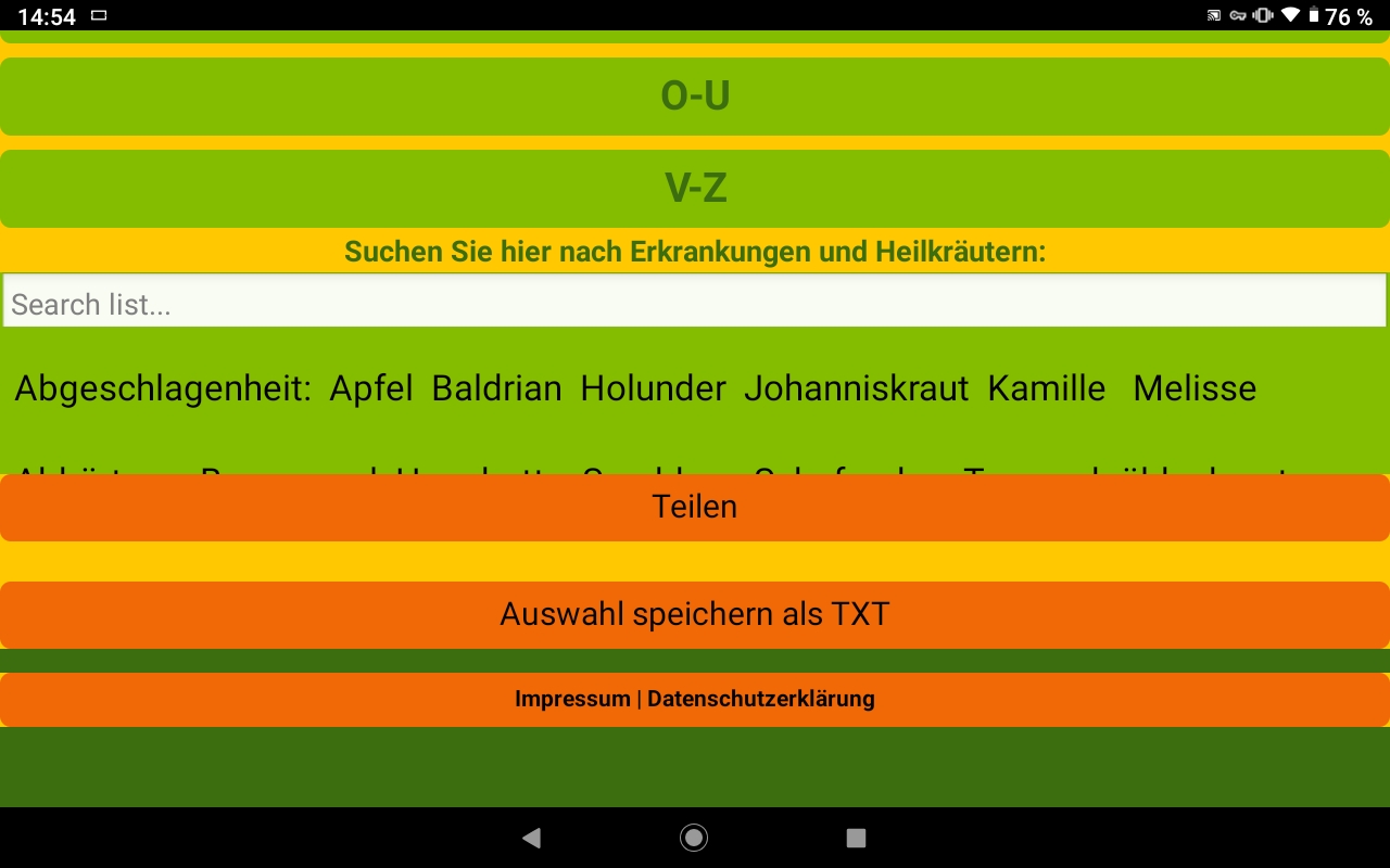 प्रकृति के प्रिय मित्रों, "हर्बलिस्ट" के साथ आप औषधीय पौधों और औषधीय जड़ी-बूटियों के रूप में प्रकृति की शक्ति के साथ अपनी बीमारियों के उपचार का सकारात्मक समर्थन कर सकते हैं। हमने कुछ औषधीय जड़ी बूटियों और औषधीय पौधों को स्वयं आजमाया और अच्छे प्रभाव से सकारात्मक रूप से आश्चर्यचकित हुए। एक पोषण विशेषज्ञ और प्रकृति प्रेमी के रूप में, मैं आपको "हर्बलिस्ट" की सिफारिश करना चाहूंगा, जिसमें निम्नलिखित सामग्री और विशेषताएं हैं:
