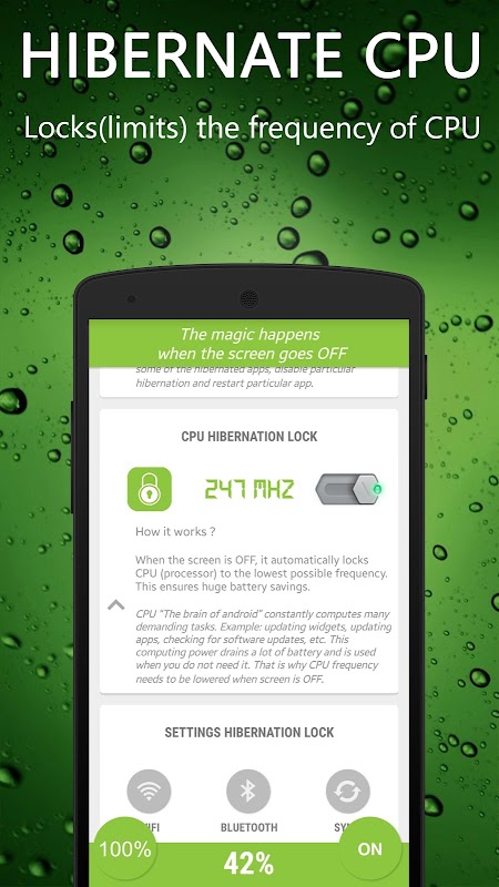 Hibernate - Real Battery Saver puts all the battery killing apps and settings in to deep sleep mode to ensure huge battery saving when the screen is off.