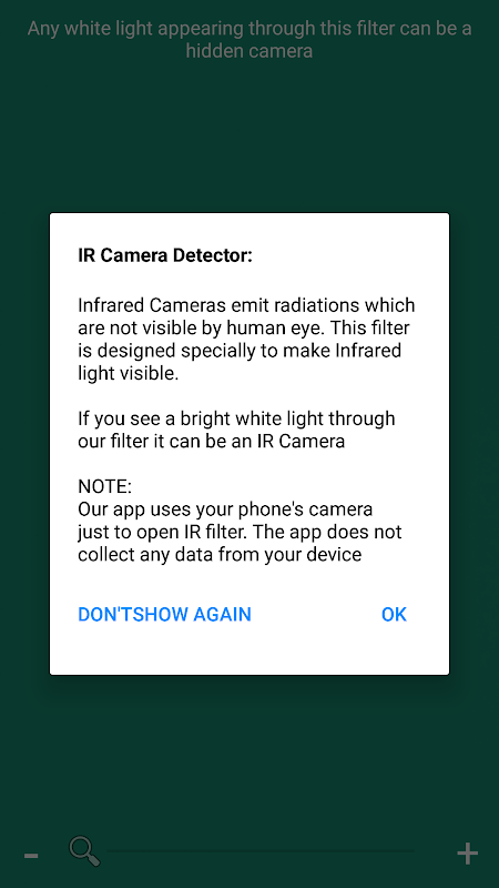 You just have to move the phone with app opened in it. It will beep if there is any potential hidden camera around. This hidden camera detector detects camera and will let you find any camera spying on you.