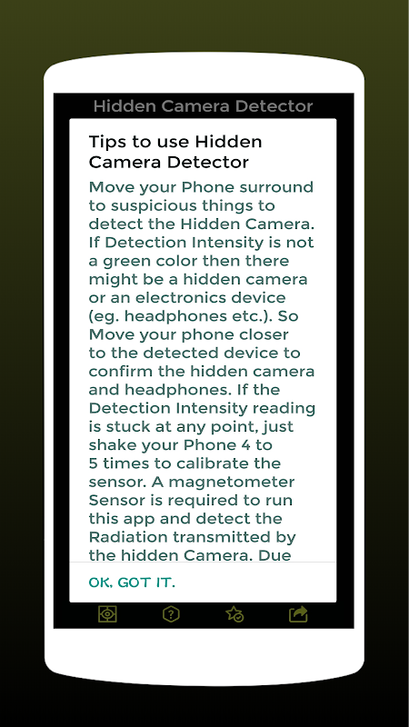 यह ऐप मैग्नेटोमीटर सेंसर का उपयोग करता है। तो इस ऐप को चलाने के लिए मैग्नेटोमीटर सेंसर की आवश्यकता होती है और छिपे हुए कैमरे द्वारा प्रसारित विकिरण का पता लगाने के लिए। सेंसर की सीमा के कारण, डिटेक्शन इंटेंसिटी डिवाइस और वातावरण के आधार पर भिन्न हो सकती है।