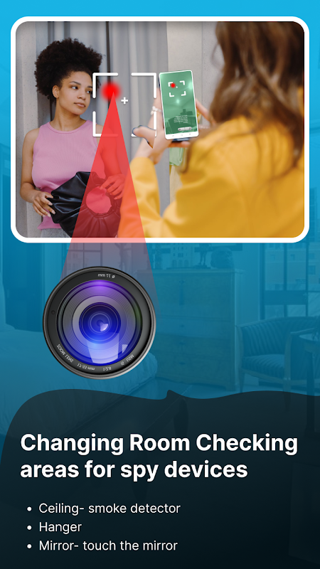 यदि आप कुछ सार्वजनिक स्थानों जैसे शॉपिंग मॉल, सिनेमा, बाथरूम, होटल के कमरे, रहने वाले कमरे आदि में जा रहे हैं, तो आप जासूसी और छिपे हुए कैमरों से खुद को बचाने के लिए स्पाई कैमरा फाइंडर के साथ चेंजिंग रूम की जांच कर सकते हैं।