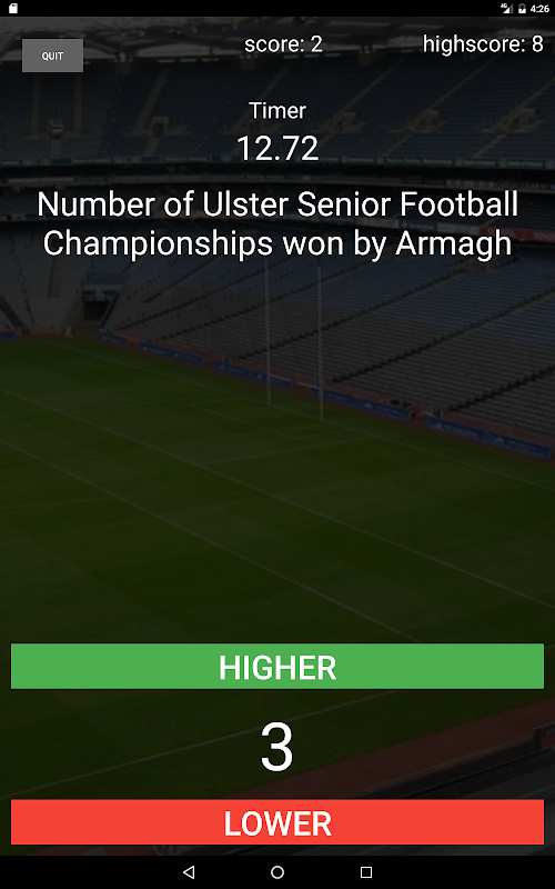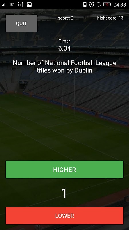 Higher or Lower Gaeilc and Hurling is a sports quiz game, based on the popular Irish sports of gaelic football and hurling, where you have to guess if the answer to the question is higher or lower than the answer to the previous question.