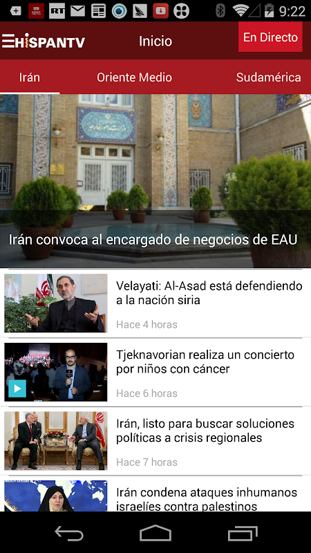 This app provides access to the latest news articles, latest uploaded videos and a live video feed, where you can watch the Spanish language channel.