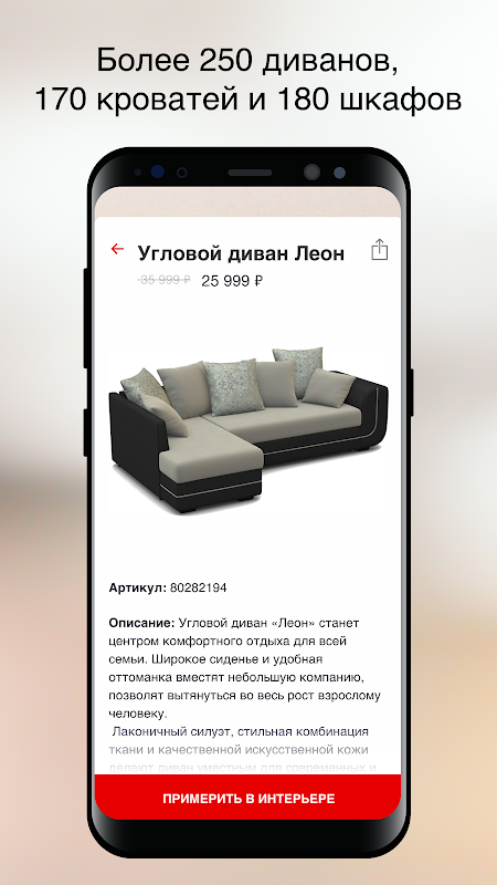 मूल्यांकन करें कि चयनित फर्नीचर आपके इंटीरियर में कैसा दिखता है। सामग्री और बनावट की विशेषताओं को जानें - वे मूल के जितना संभव हो उतना करीब हैं। क्या आप संतुष्ट हैं? अपने पसंदीदा फर्नीचर को तुरंत ऑर्डर करें - बिना ऐप को छोड़े। और आप इसे अपने दोस्तों के साथ भी साझा कर सकते हैं - तत्काल दूतों के माध्यम से या ईमेल के माध्यम से।