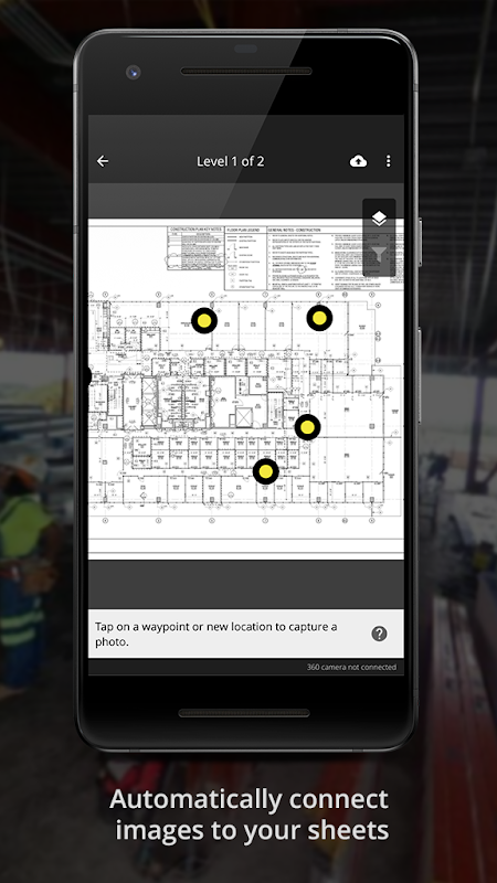 3. शीट पर वांछित छवि स्थान टैप करें और फिर 360 डिग्री छवि लेने के लिए कैप्चर बटन टैप करें। छवियों को स्वचालित रूप से टाइमस्टैम्प किया जाता है और फर्श योजना पर स्थान से लिंक किया जाता है। पूरी परियोजना को कैप्चर करने के लिए अपनी प्रक्रिया में अपनी प्रक्रिया को दोहराएं और फिर अपने प्रोजेक्ट को अपने खाते में सिंक करें।