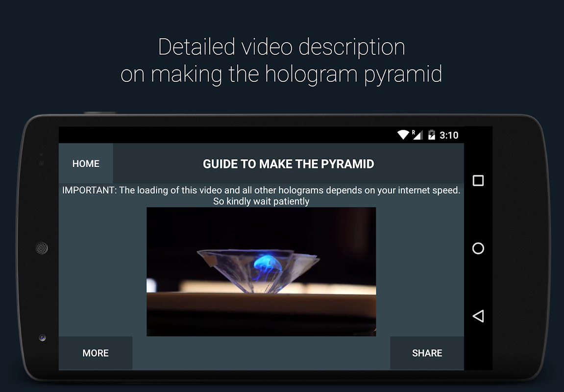 एक होलोग्राम आयामी एक 3 एक छवि या एक वीडियो का प्रतिपादन और वे अंतरिक्ष में वहाँ होना दिखाई देते हैं तो यह है कि अंतरिक्ष में उन्हें converging है। यह एप्लिकेशन होलोग्राफिक मशीन के रूप में ही काम करता है, जो एक सरल DIY पिरामिड का इस्तेमाल करता है। होलोग्राम वे जुटे और अपने स्मार्टफोन के लिए स्क्रीन के शीर्ष पर एक सही होलोग्राफिक एनीमेशन का उत्पादन कर रहे हैं कि इस तरह से इनकोड किया गया है। यह इतना आसान है और अभ्यस्त करने के लिए अधिक से अधिक 5 मिनट ले लो। पिरामिड बनाने के लिए गाइड एप्लिकेशन के भीतर उपलब्ध है।