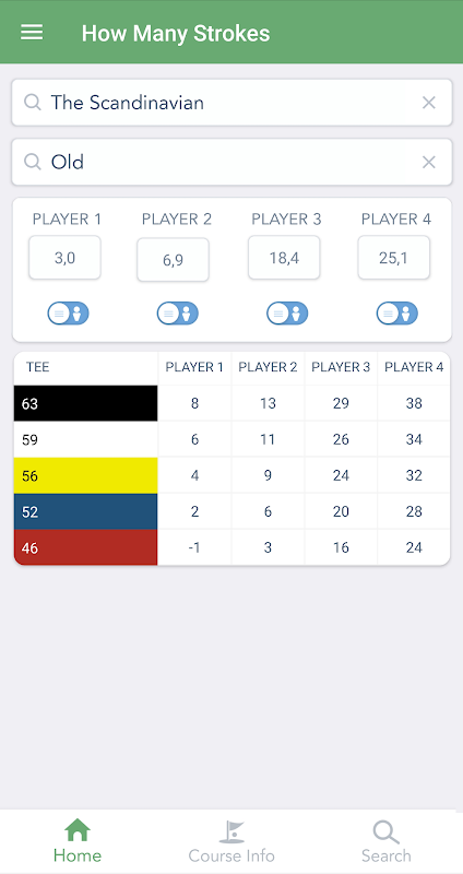 बस आप और आपके गोल्फ के दोस्तों के लिए हैंडीकैप में टाइप करें और आप देखेंगे कि प्रत्येक टी बॉक्स पर आपके पास कितने स्ट्रोक्स हैं।