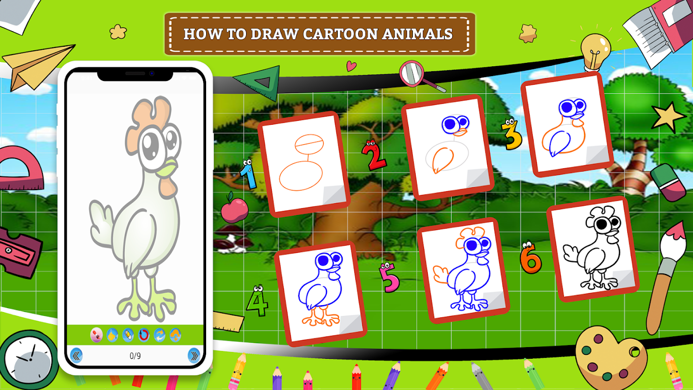 Pictures of cartoon animals can be drawn with pencil and paints, colored pens, whatever you like on paper or use this application on mobile devices and tablets. Each sketch in simple steps allow you to make fabulous drawings, just take a paper and a pencil or in application you can make the drawing, choose the sketch from the application you like and follow step by step instructions. It is very easy to use and your ability to draw will further improve in every new picture.