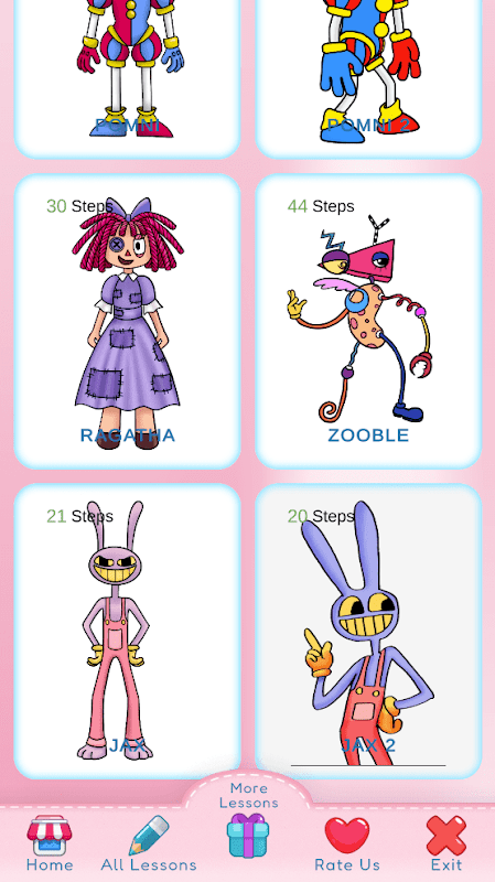 अद्भुत डिजिटल सर्कस कैसे बनाएं ऐप में लोकप्रिय कार्टून अद्भुत डिजिटल सर्कस पात्रों को कैसे आकर्षित किया जाए, इस पर विस्तृत पाठ शामिल हैं। पालन करने में आसान निर्देशों और स्पष्ट चित्रों के साथ, आप अपने स्वयं के आश्चर्यजनक चरित्र चित्रण बनाने के लिए आवश्यक तकनीकों में जल्दी से महारत हासिल कर लेंगे।