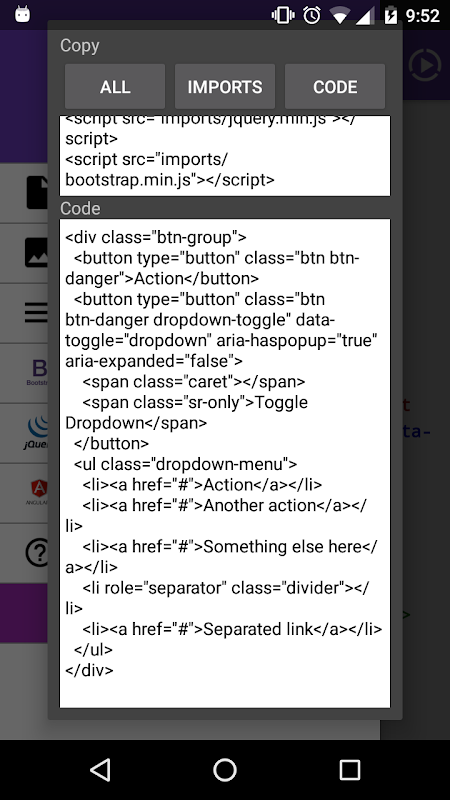 प्रोग्रामर काम करने के लिए आसानी से इस एप्लिकेशन को उपयोगकर्ता एक क्लिक के साथ सीएसएस और एचटीएमएल टैग उत्पन्न कर सकते हैं जहां कस्टम कीबोर्ड है। इस एप्लिकेशन को बूटस्ट्रैप, AngularJS और jQuery के बुनियादी उदाहरण होते हैं। इसके अलावा इस एप्लिकेशन को मोबाइल मेनू के कुछ उदाहरण रखती है।