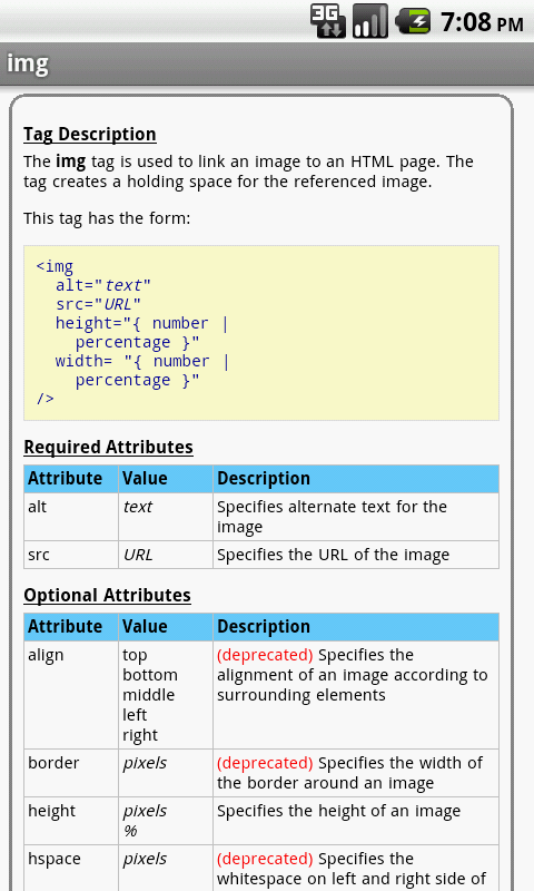 एचटीएमएल टैग में वर्गीकृत और खोज कर रहे हैं। प्रत्येक टैग जानकारी स्क्रीन एक विवरण, मानक और वैकल्पिक विशेषताओं, घटना विशेषताओं, उदाहरण, ब्राउज़र संगतता, वैध DTD के मेज, और संस्करण में जानकारी है। इसके अलावा, उदाहरण के अधिकांश वास्तविक गाया उत्पादन शामिल है।