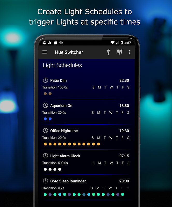• सप्ताह के सभी या निश्चित दिनों में आवर्ती, दिन के निश्चित समय पर दृश्यों को ट्रिगर करने के लिए लाइट शेड्यूल बनाएं।