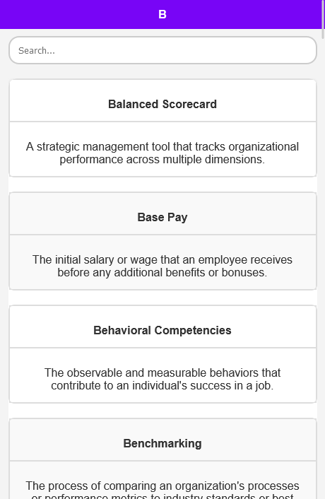 यह मानव संसाधन प्रबंधन शब्दकोश ऐप बुनियादी परिभाषाओं से परे है, जो एचआरएम में आपके पेशेवर विकास और शैक्षिक गतिविधियों का समर्थन करने के लिए एक मजबूत टूलसेट प्रदान करता है। चाहे आप परीक्षा की तैयारी कर रहे हों, शोध कर रहे हों, या अपने ज्ञान को गहरा करना चाह रहे हों, हमारा व्यापक मानव संसाधन प्रबंधन शब्दकोश आपकी आवश्यकताओं को पूरा करने के लिए तैयार किया गया है।