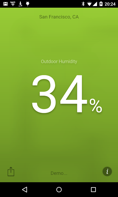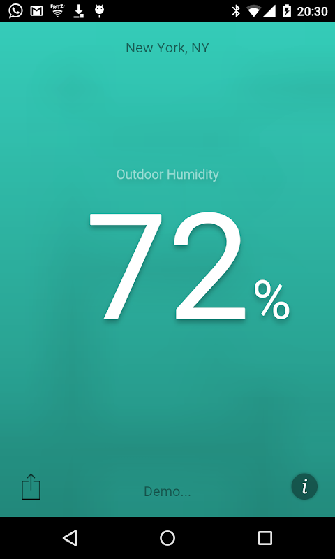 यह आवेदन वर्तमान रिश्तेदार आउटडोर आर्द्रता, जिसके लिए वह अपने वर्तमान स्थान का उपयोग करता पास के एक मौसम स्टेशन द्वारा मापा पता चलता है।