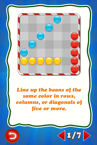 1: Match 5 or more of the same color beans together(horizontal, vertical or diagonal ).