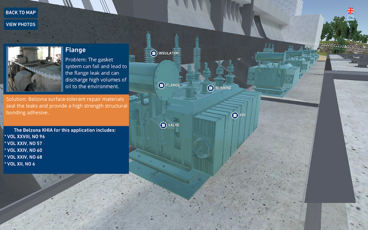 बेल्ज़ोना इंटरेक्टिव सॉल्यूशंस मैप आपको सैंपल हाइड्रोपावर प्लांट के माध्यम से नेविगेट करता है जो अधिकांश प्रकार के जल विद्युत संयंत्रों के लिए विशिष्ट क्षेत्रों और उपकरणों को दिखाता है। मानचित्र संयंत्र में प्रत्येक क्षेत्र और उपकरण का विवरण प्रदान करता है, सामान्य समस्याओं पर प्रकाश डालता है और बेल्ज़ोना द्वारा संभावित समाधान प्रदान करता है। इस मानचित्र के साथ आप सीखने में सक्षम होंगे कि जलविद्युत संयंत्रों का क्या अनुभव हो सकता है और उन्हें बहुलक तकनीक का उपयोग करने और उन्हें हल करने के तरीके को कैसे हल किया जा सकता है।